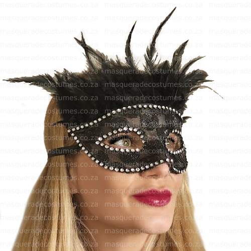 Elegant Lace Feathered Mask with Diamante Gemstone, Black